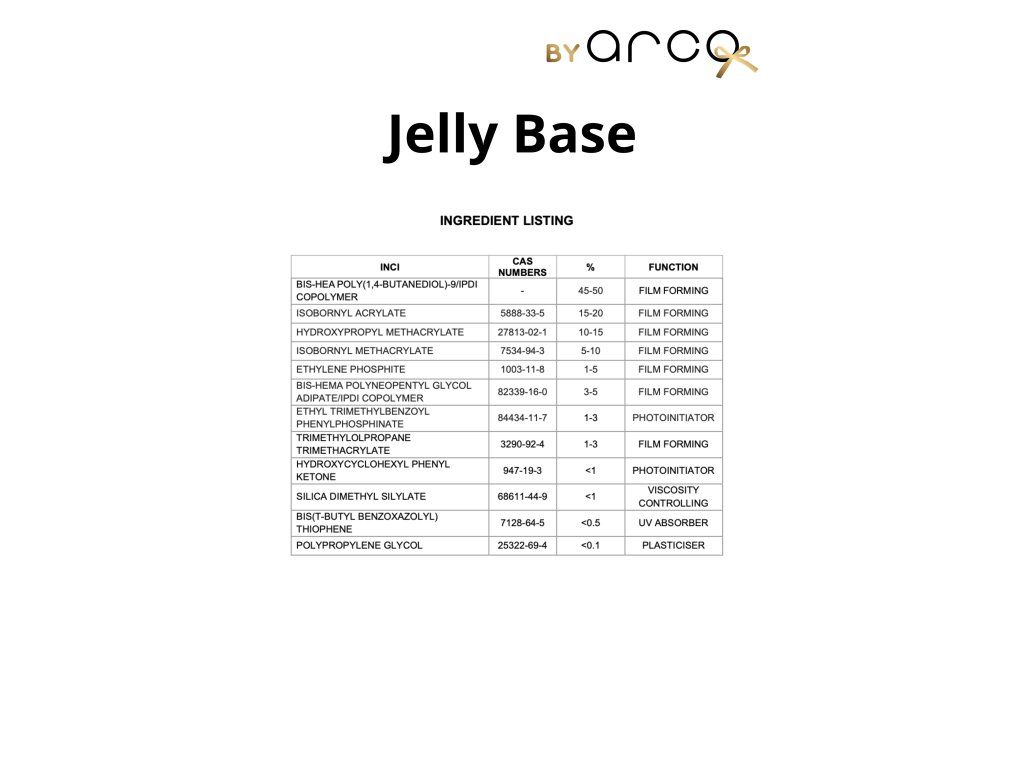 Jelly base je pružná báze, která je vhodná pro všechny tipy nehtové ploténky a hravě si poradí i s velmi poškozenými nehty. Neobsahuje složku HEMA a proto je vhodná i pro citlivé klientky.